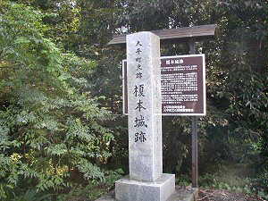 住宅地の中を走っているとガサ薮の中に写真の碑と案内板があるのが目に入ってくる。しかし、この案内板、建て方を間違えている、と思う。こんなに碑の真後ろに建ててしまっては、読むこのもつらい。実際、写真に撮ろうとしたのだが、どんなに工夫しても正面から撮影することは不可能だ。しかし、大平町はこういう建て方にこだわりがあるのであろうか。富田城も同様だ・・・・・・。