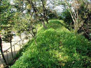 本丸東側の土塁。堀は埋められてしまったようだが、土塁はしっかり残っている。版築されたものでしっかりと盛られている。高さ5mほどである。