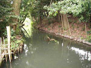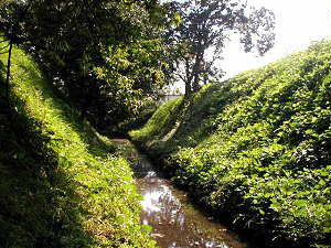 堤防と城との間の水堀。往時もこんな感じであったのであろう。この堀の水は北方の湧水点から引いてきているもので、この地域一帯の水田を潤しているのであるという。椿田城主はこの水路を押さえることで、水利権をも掌握していたのであろう。