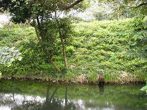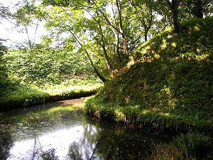本丸西側の堀と城塁。現在も水が湛えられている。深さ6m、幅8mほどで、ほぼ往時のままの形態を偲ぶことができる。写真の左側が本丸城塁。右側が外側の土塁で、この先にも同様の堀があり、この部分は二重堀構造となっていた。