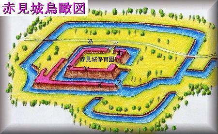 赤見城は方形の本丸とを中心とした平城で、現在は赤見城保育園の敷地となっている。鳥瞰図は西側から見たものである。城塁は東南の角の部分が保育園の園舎を建築した関係で破壊されてしまっているが、それ以外の部分は良好に残されている。下野地域にはこのような方形館から発達した平城がたくさん残っている。赤見城もその1つで、本丸の形状は児山城、上三川城などとよく似ている。