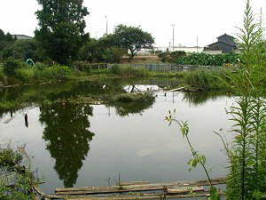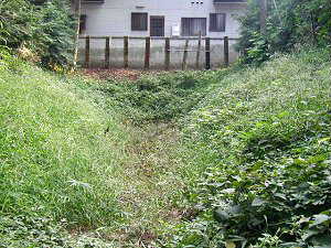 総堀はすべて埋められているが、地形的に確認できる場所もある。写真は城東中学校の東側の((お)の辺りである。比高5mほどの土手が今もはっきりと残っている。この土手に沿って水路が走り、これが堀の名残であったと思われる。