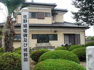 堀田佐野城は植野城ともいい、国道50号線の北側の堀田稲荷神社周辺にあった。城址には写真のような立派な碑や標柱が建っている。この標柱では「佐野城」としているが、この名称では春日岡城と混乱してしまいそうだ。