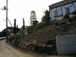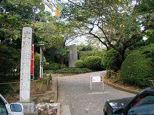 駐車場となっている三の丸から記念館のある二の丸に上る坂道(あ)。車道を通すために地形が大分改変されてしまっているが、上った所に段差が見られるので、もともとは内枡形が存在していたのではないかと思われる。
