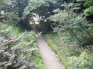 本丸西側の二重堀の間の土塁。この土塁の中央に立って、二重堀を写してみた。右側下が本丸堀。左側下が外堀である。