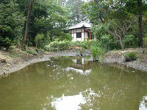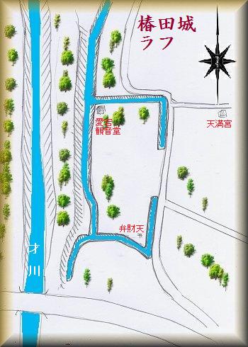 写真は南側にあった水堀の跡である。奥に見えるのは椿田城主福地氏の守護神である十一面観音堂。福地氏はたびたびの軍で矢や弾丸を兜に受けたが、偶然にも負傷せずにすんだ。福地氏はこれをこの観音の加護によるものだと感じて、篤く信仰したという。