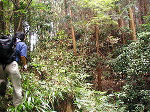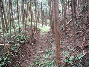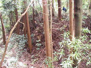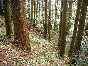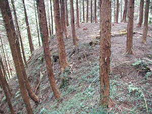 2郭の先の空堀。深さ4m、幅6mほどで、この先は自然地形のように見えるので、城域は一応ここで終わるかと思われるのだが、薮でよく分からない。さらに郭が続いている可能性もある。