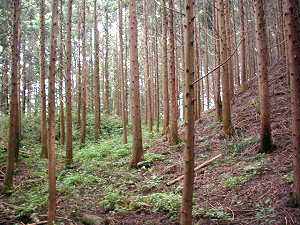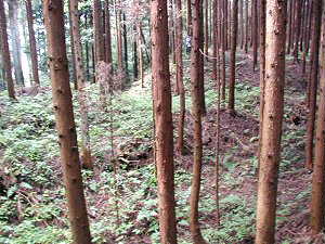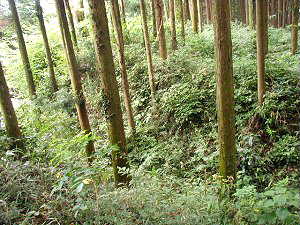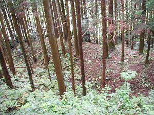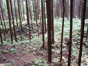 1郭と3郭との間にも深さ7mほどの堀切があり、これは下まで竪堀のように落ちていく。3郭辺りは薮がひどくて形状がよく分からないのだが、段々に郭が配列されており、この下にも、居館部を思わせるようなスペースがあって、そこに観音寺が建っている。観音寺や温泉神社の前面には平地があるが、このさらに前面に水堀があったらしい。とすると、この平地部分にも家臣団屋敷などがあったのかもしれない。