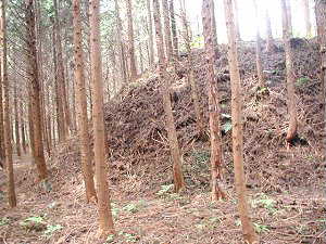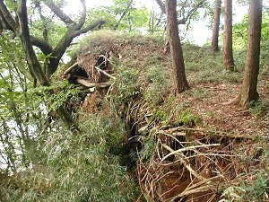 1郭横堀から見た、1郭の城塁。右が1郭北西側の城塁になるのだが、意外とこちら側の斜面は緩やかである。左手奥に見えるのが横堀の外側の土塁で、その先は断崖となって箒川に落ちていく。この川の方はかなりの断崖なので、こちら側からの城攻めはそうとう厳しいであろう。