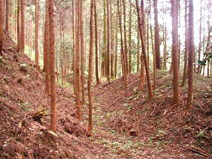 1郭と2郭との間の空堀。薬研堀できれいに掘られている。横矢構造のクランクも設けられている。