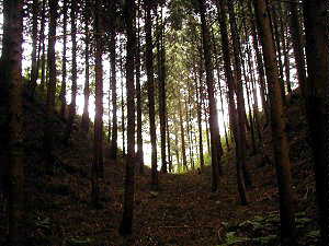 1郭と3郭との間の横堀を、1郭側の土橋の上から見てみた。深さ7m、幅12,3mほどある。法面がずるずる滑るので、なかなか登り降りしにくい。
