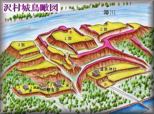 沢村城を南西上空から見てみた。麓に観音寺と湯泉神社のある比高25mほどの台地上にある。この台地は箒川に臨む断崖上に築かれたもので、城塁の上から下の箒川を望むと、吸い込まれてしまいそうになる。しかもあちこちオーバーハングしている。塁上に立つときにはその点に気をつけよう。