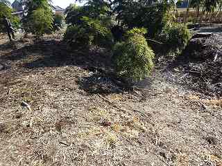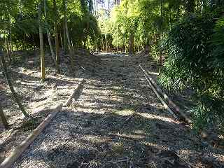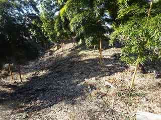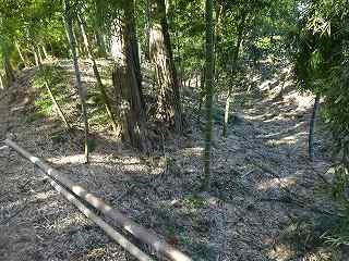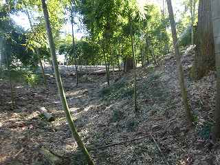 その先の北東側の道路沿いには、2mほどの段差が認められる。ただし、この部分はAやBの堀跡と比較してみると、角度があまりにも鋭角的に過ぎる。この土手状のものは、北東側に道路を造成したために生じたものであるのかもしれない。