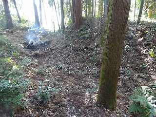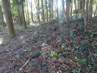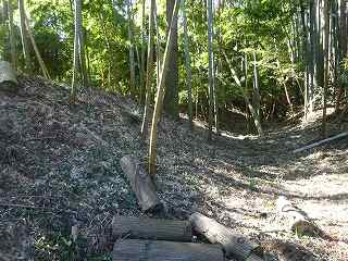Bの土塁の東側の山林内部にも浅い窪みが南北に延びているのだが、こちらはあまりにも痕跡的なものであり、堀跡なのかどうかよくわからない。
