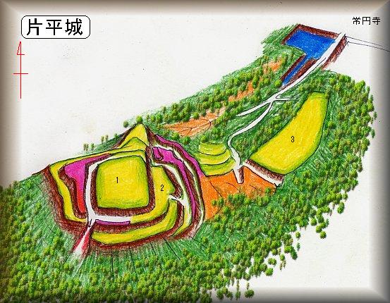 片平城は常円寺の南側の山上にあった。比高40mほどの台地である。ざっと歩いてみたのだが、この城はとにかくイバラが多い。特に1郭周辺はイバラだらけである。これではきちんと歩くこともできない。時間も夕方になっていて、足腰もすっかりへばっていたこともあって、堀の接続部分や腰曲輪の縁の方などきちんと確認できなかった。というようなわけで、この図は実際とだいぶ違っている所があると思うが、まあ、大体こんなイメージの城であるといった程度に見ていただきたい。