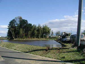 | 国道293号線の三輪方面から片平方面に入って南に進み、熊野神社の東下を通っていくと、西側に写真の標柱が見えてくる。これが戸田城の入口である。この正面の比高40mほどの山が城址である。ここを進み、突き当りの神社の所を左に曲がり墓地の前を通って進むと城址に上る山道が見えてくる。 | 1郭の横堀。深さは郭内側から5m、郭外側からは2m弱とそれほどでもないが、きれいに残っている。 |