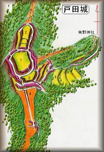| 戸田城主等、歴史は未詳である。しかし、東南わずか1kmの所に、似たような構造の片平城があることからすると、片平城の支城の1つであったと考えるのがよさそうである。戦国期、片平氏などの那須一族は那珂川を隔てて佐竹側の武茂氏と対峙しており、武茂氏の侵攻に備えて支城網を充実させておくことが必要であったのだろう。 | |