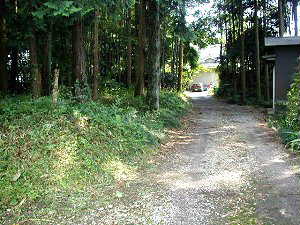 (あ)の辺りに土塁の切れがある。後世のものかもしれないが、ここを入っていくと、両側が少し窪んでおり、堀の跡のようにも見える。一見、この辺りが三重の堀になっていたのかとも思われるのであるが、よく分からない。それよりも、主郭部の堀は(い)の内側辺りではかなり埋められているようで、現状ではただの道になっている。この部分の堀を埋めるために、外郭の土塁が崩されて用いられたりしたであろうし、(い)の辺りの窪みも、その際に土取りをされた跡なのかもしれない。