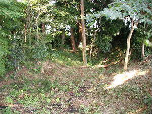 | 横堀の西側下の古墳状の部分を見たところ。 | 3郭内部。西側は堀状の窪みとなって南側に続いて行く。 |