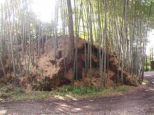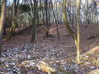 | 5郭より南西側の郭縁部にある古墳。 | 三ノ宮神社北側の切岸。 |