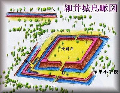 細井城は、光明寺の敷地内となっているので、光明寺城とも呼ばれる。光明寺のある方80mほどの郭を中心とした平城である。城の周囲には高さ3〜5mほどの高い土塁が取り巻き、周囲には深さ5m、幅7mほどの堀が取り巻いていた。