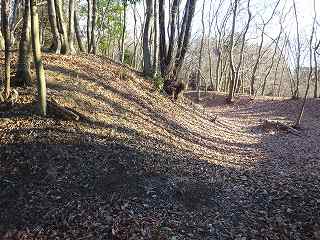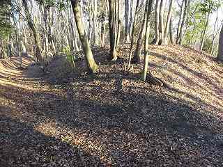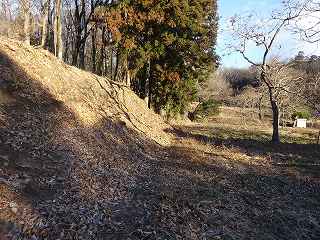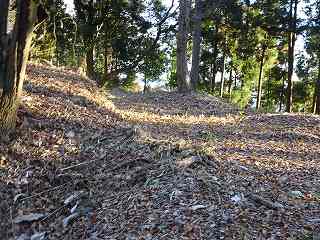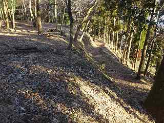 | この堀切は西側に延びていき、3郭と5郭との間まで続いている。 | 1郭南側の城塁。折れが見られる。 |