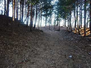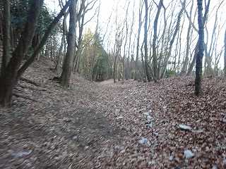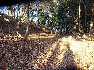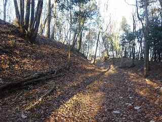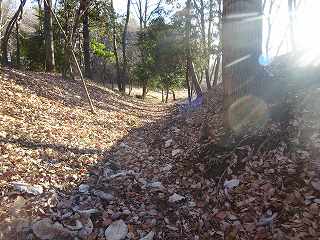 2郭・3郭のある尾根も平坦ではなく、南側に向かって傾斜していたようだ。そのため2郭と3郭との間には段差があり、3郭先端に向かう通路が堀底状の傾斜地形になっている。