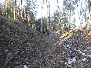 谷戸内部の道をまっすぐに進んで行くと、またもやしっかりとした城塁が見えてきた。1郭南側の城塁である。とはいっても、こちらも高さは3mほどであるから、長さのわりには高さはそれほどでもない。それでも折れを描きながら延びている様は、なかなか技巧的で、戦国期の築城を想像させるものである。