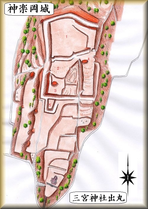 3郭の中心部には古墳が1つ残されている。神楽岡は、もともとは古代の集落跡であったのだろう。城内にはあちこちに古墳らしきものが認められる。ほとんどが改変されているようだが、3郭のものはいかにも古墳らしく見えている。4にも古墳があるし、また、城塁の縁部分にもいくつかの古墳が存在している。
