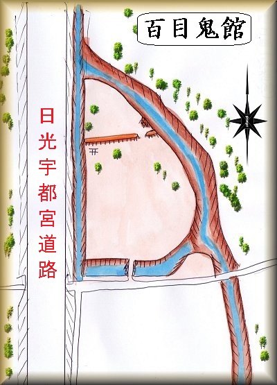 百目鬼館は、日光宇都宮道路のすぐ東側に位置している。半蔵山の東側の先端下辺りである。館跡を巡るように沢が入り込んでおり、周囲を小川が流れていて、天然の堀を形成している。