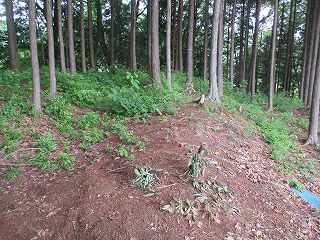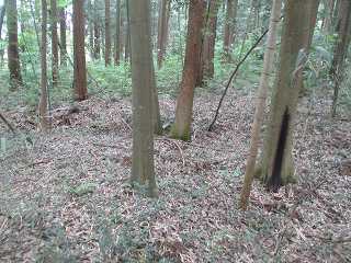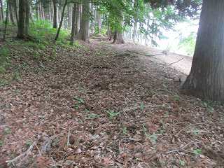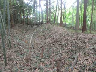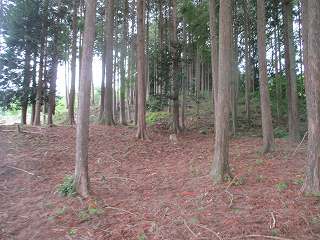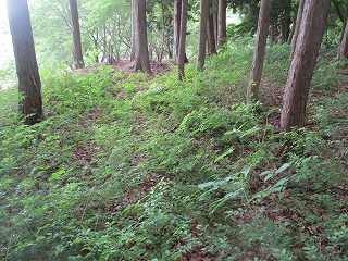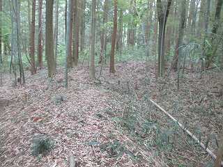 北側下から台地に入り込んで行くと、内部はヤブのない見通しの良い杉林となっている。正面に見えているのが城塁である。