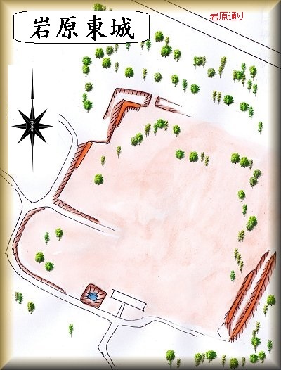 岩原神社の東200mほどのところの、住宅地一帯が岩原東城の跡だと言われている。「堀ノ内」と呼ばれている一帯である。
