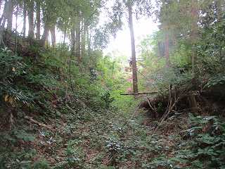 南側の作業所の所からアクセスしてみると、山林の中に2本の堀が残されているのが分かる。堀の間は傾斜地形となっており、竪堀と竪土塁状の地形を見ることができる。