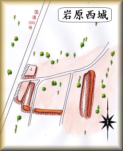 岩原西城は、国道293号線沿いにある。国道沿いにやや高くなった地形があり、その間を通って東側に入って行く道が付けられている。やや高くなっている地形は櫓台の跡のように見えている。