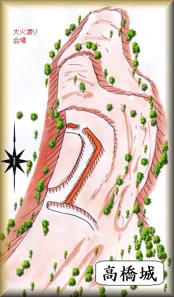 それを登って行った所に、横堀に囲まれた半円状の地形が見えてくる。これが高橋城の跡である。