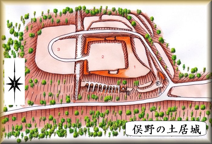 俣野の土居城は、俣野地区の東方の上に築かれている。集落の道を東方に進んで行くと、道が2つに分岐するところがある。ここからさらに北西方向に進んで行くと、道は3郭を通ってそのまま2郭に進入していくようになっている。