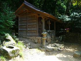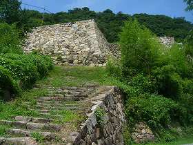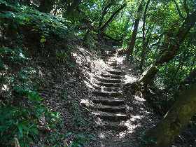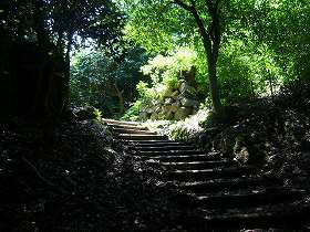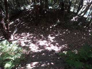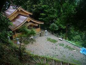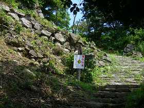 天球丸の脇から、山上の城にあがっていく。けっこう勾配がきつく、息が上がりそうになる山道である。途中に「一合目」から「九合目」までの案内が出ており、これを目標にしながら登っていくと、意外に早く、20分ほどで登ることができた。この日の気温は35度、しかし、暑いなあ・・・・。 | 5合目辺りの平場にあった何かの神社。 |