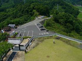 模擬天守。入城は無料であった。 | 模擬天守の望楼から見た下の駐車場。その先の小高い部分が古墳広場である。 |
