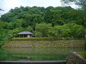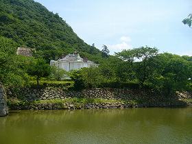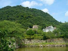 山麓の堀越しに見た久松山。下からの比高は200mほどある。高さもさることながら、地勢が急峻で、登るのに疲れる山である。 | 堀越しに見る仁風閣。風情のある建物だ。明治40年(1907)に、当時の皇太子(のちの大正天皇)の山陰行啓の宿舎として旧鳥取藩主の池田氏によって建造されたもので、その後は池田氏の別邸として使用された。内部には歴史資料が展示されている。ちなみに仁風閣という名称は、当時、皇太子に随伴していた東郷平八郎によって命名されたものであるという。 |