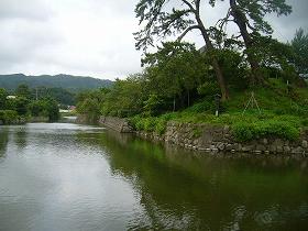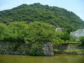 堀に架かる橋から大手方向を見てみた。 | 堀越しに見る御三階櫓の石垣と久松山。 |