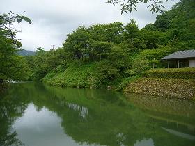 平城部分のあった鹿野中学校を目指していくと、すぐに中学校の前面の水堀が見えてくる。山麓部分の遺構は、近世城郭ものというに似つかわしいだけの壮大なものである。水堀は幅20mほどもある大規模なものであり、深さもけっこうありそうだ。