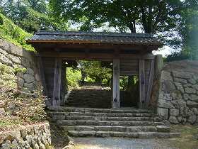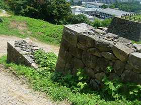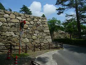 県立博物館の方から上がっていくと、唯一の現存建造物である城門が見えてくる。 | 御三階櫓のあった二の丸の石垣。高さ10m近い高石垣である。 |