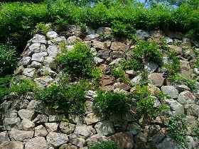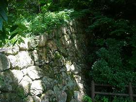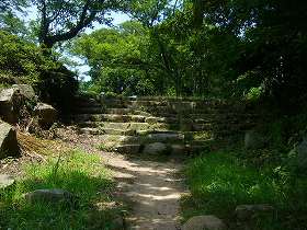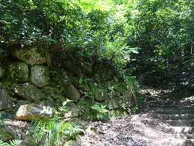 山道の途中には、このように石垣が積まれている部分もある。 | やっと山上近くまでやってきた。正面奥に見えるのが、山上の丸(本丸)の石垣である。 |
