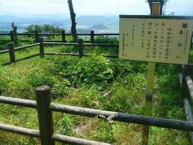 天守台の下にある城山神社。 | 山頂の天守台。10m四方ほどしかないが、礎石が残っている所を見ると、三層程度の天守が実際に建っていたのであろう。 |