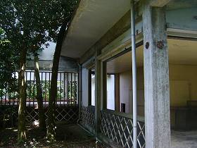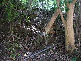 その先の平場にあった虎口を、外側から見たところ。両脇には石垣が積まれており、櫓門でもあったようである。 | その虎口からさらに進んでいくと、荒れ果てた建造物が藪の中に建っていた。中に入ってみると、どうもこれはロープウェイの施設であったらしい。現在は廃止されてしまっているので、荒れ果ててしまっているというわけだ。 |