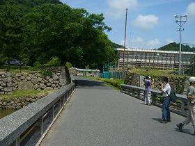 川越しに見る河原城。模擬天守があるため、かなり遠くからでも城らしく見える。 | 天守の入り口。立派な石垣や門があるが、もちろんみな模擬建造物である。 |