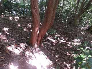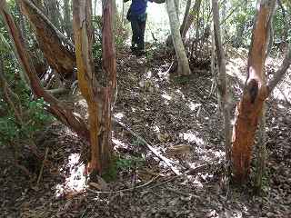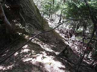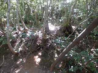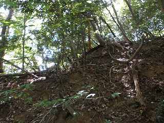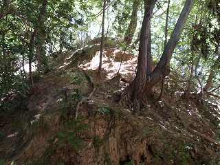 この切岸は現在でも鋭く、直登は難しい。北側の羽柴勢に備えて鳥取城方が構築したものであろうか。何とか登れそうなところを探してよじ登って行く。