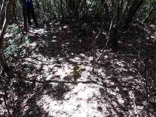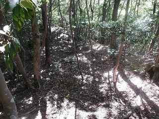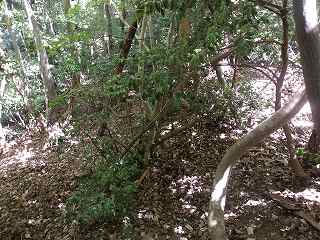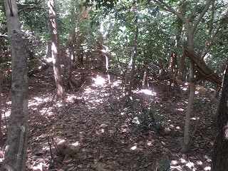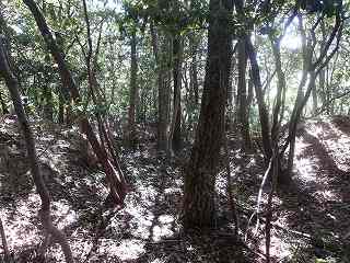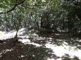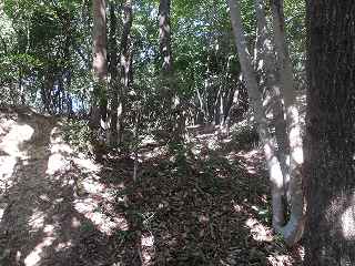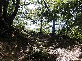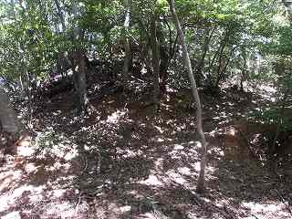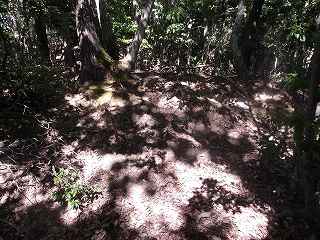 登った所が尾根である。ここを西側に進んで行くと、低い切岸があり、その先のピーク部が西端ノ砦の1郭である。土塁囲みの郭であるが規模は小さく、土塁もかなり低いものである。