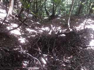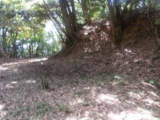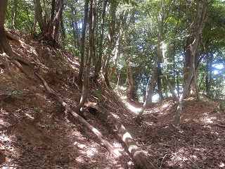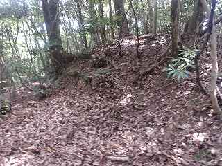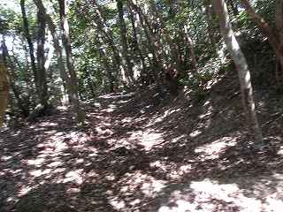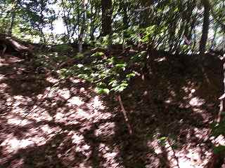 尾根続きに羽柴藤五郎陣へ。虎口。 | 土塁。 |