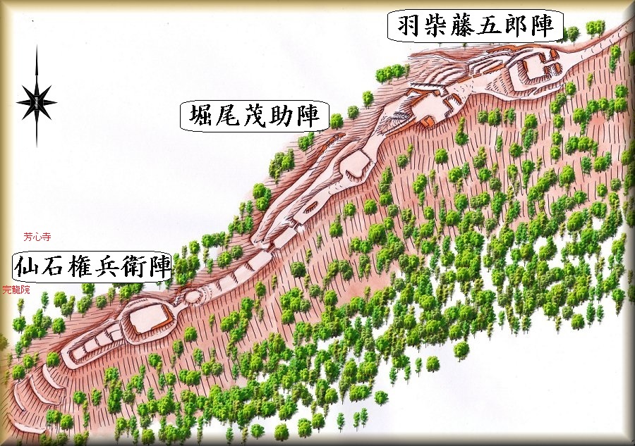 尾根続きに堀尾茂助陣へ。 | 堀。 |